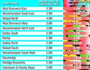 In the four Black Country boroughs people spent nearly £40 million on lottery tickets over the period, but received less than £16m back in grant funding – a shortfall of £23.7m.