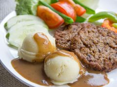 This was another classic feature of school dinners in the 1980s which has gone out of fashion - two dollops of mashed potato served using an ice cream scoop. | Photo by Jess Ho: https://www.pexels.com/photo/close-up-shot-of-food-on-the-plate-7837694/