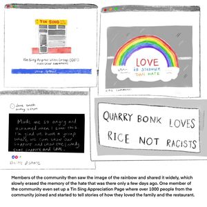 Joanne Wong, a British-born Chinese illustrator living in Hong Kong, was moved to create an online comic strip story telling how the community banded together to show love and support for the owners of the Tin Sing takeaway after the shop was vandalised with racist graffiti.