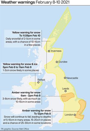 The worst of the disruption was in London and south-east England where around 5cm-10cm (2in-4in) was set to fall, reaching up to 30cm (11.8in) in the worst affected regions.