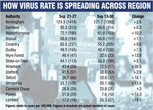 Wyre Forest, Telford & Wrekin and Shropshire are among those that have seen double-digit increases in the rate of people infected per 100,000.