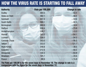 In the seven days to November 19, the infection rate dropped by 12 per cent in Dudley to 484.5 per 100,000 population. In Sandwell it fell by the same amount to 447.6.