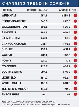 While in Staffordshire, the case rate for the week to December 17 per 100,000 people was 248.1 for Cannock Chase, 220.7 in Stafford, 204.6 in South Staffordshire and 184.2 in Lichfield.