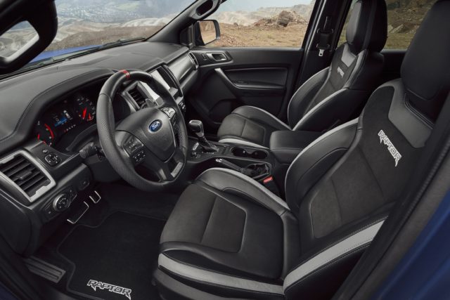Don’t expect this to be a totally refined, hard-core machine built just for jumping sand dunes, though. A number of creature comforts make the Ranger Raptor liveable day to day, including suede-effect materials throughout the cabin and Ford’s Sync 3 infotainment system as standard.