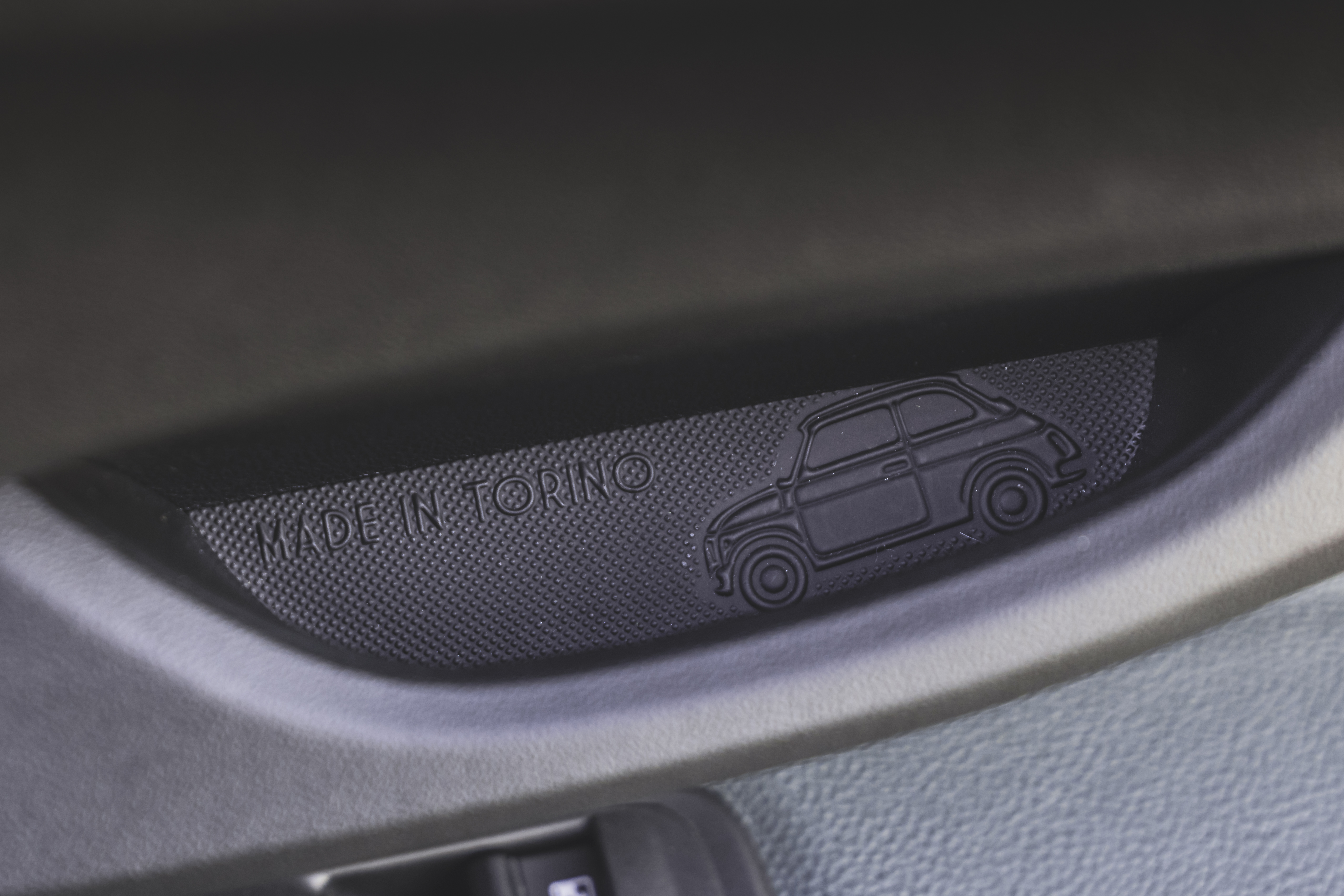 Some cool little touches are the ‘Made in Torino’ rubber mats with the original Fiat 500 pictured in the door pulls and the little storage cut out in the centre of the dashboard, which features an outline of Turin.