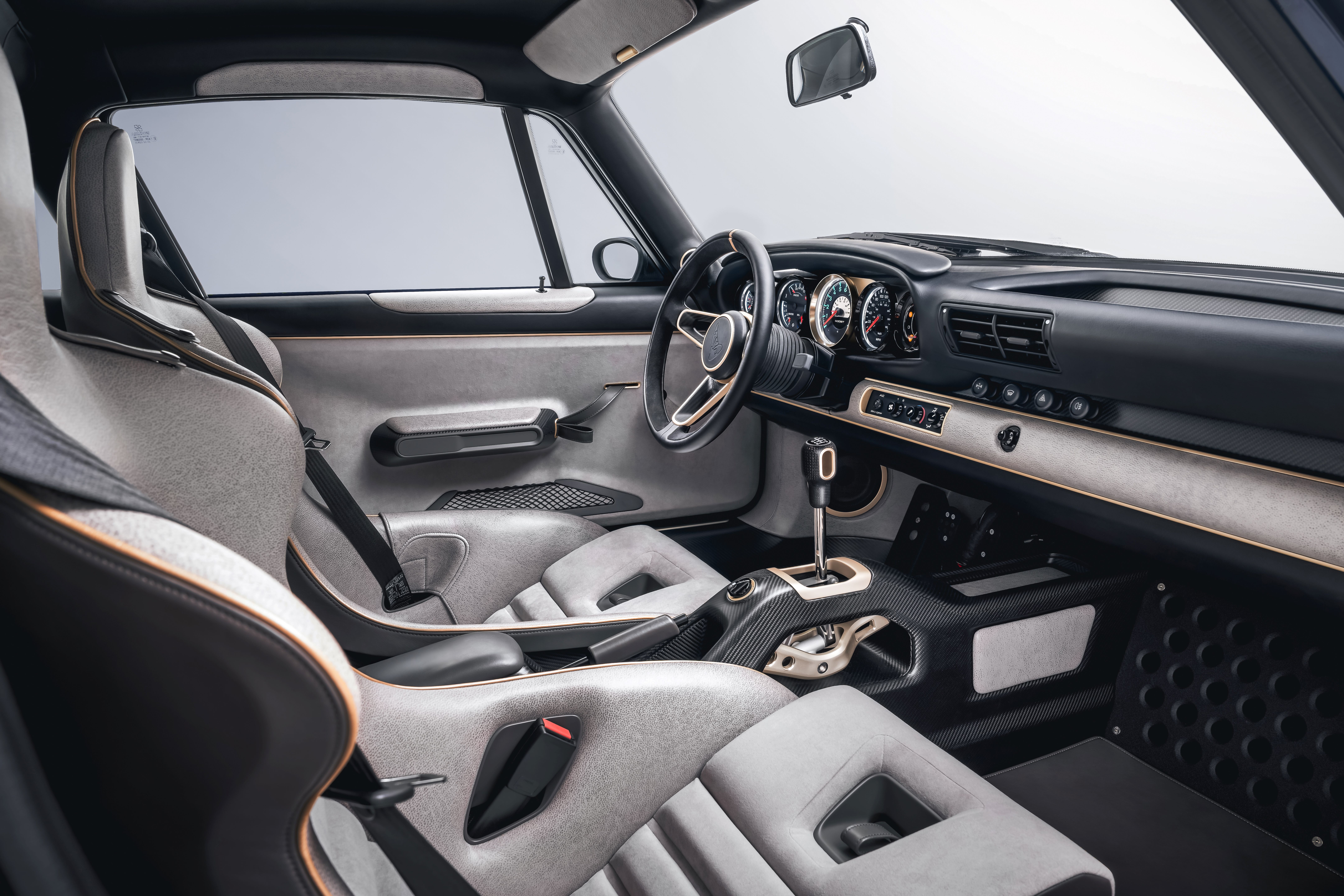 The interior gains Pebble Grey upholstery with hand-built floating gauges. (Singer)