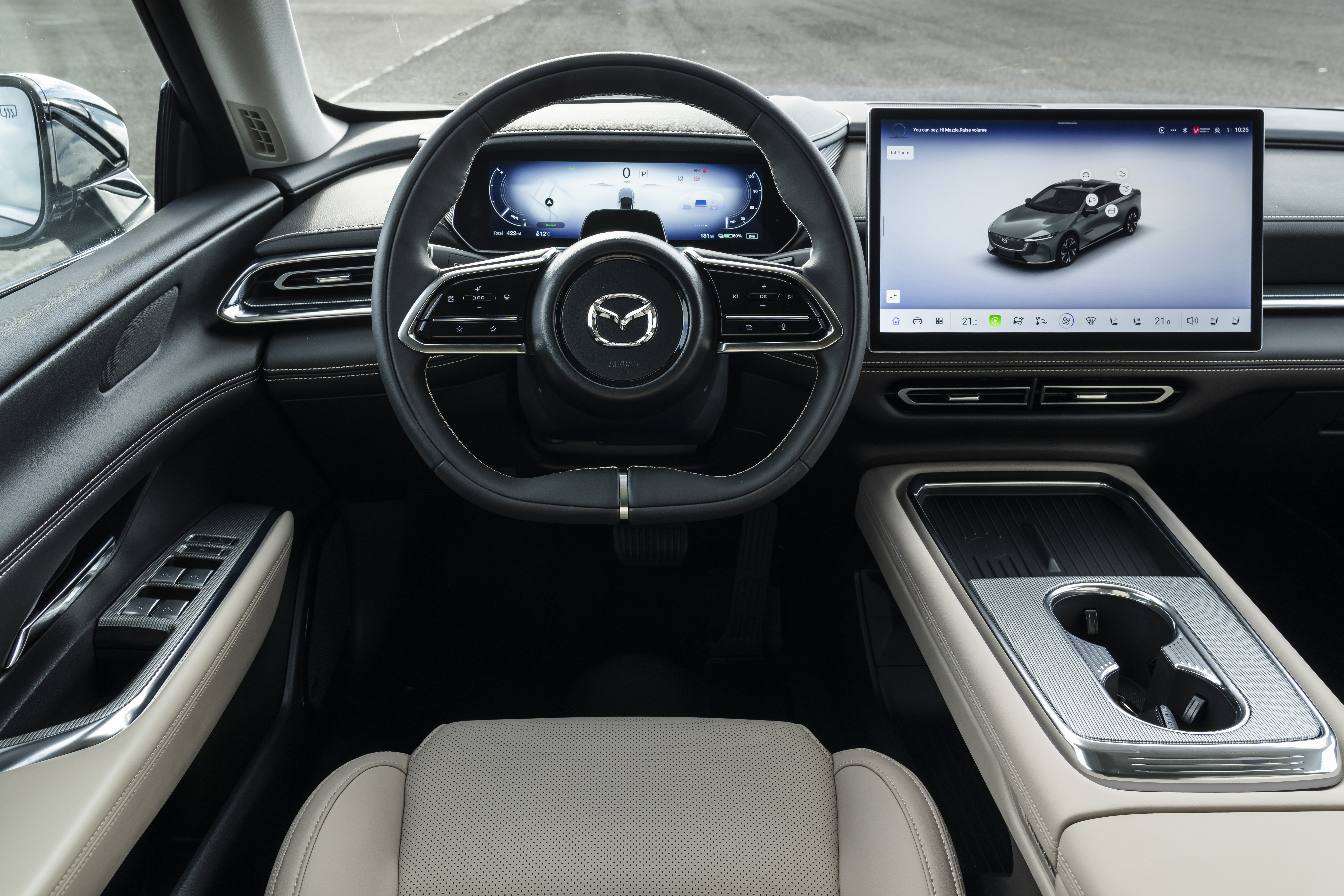 Inside, the dashboard is complemented by a 14.6-inch touchscreen display and a 10.2-inch digital instrument cluster, while Mazda has removed several physical buttons for a cleaner cabin layout.