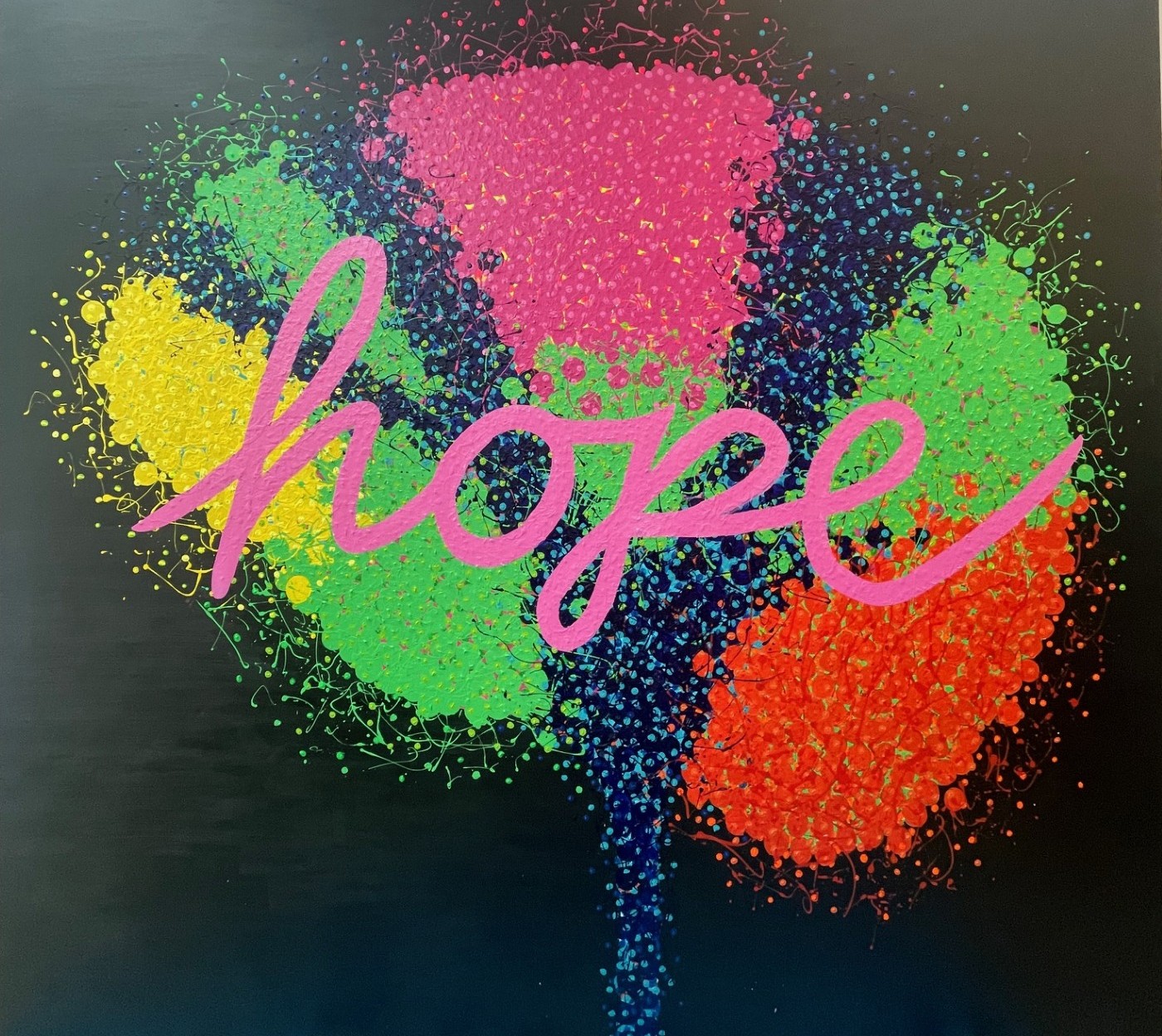 The artwork is an abstract painting of a functional MRI scan, but hidden beneath the surface are messages from glioblastoma patients that are only visible under ultraviolet (UV) light.