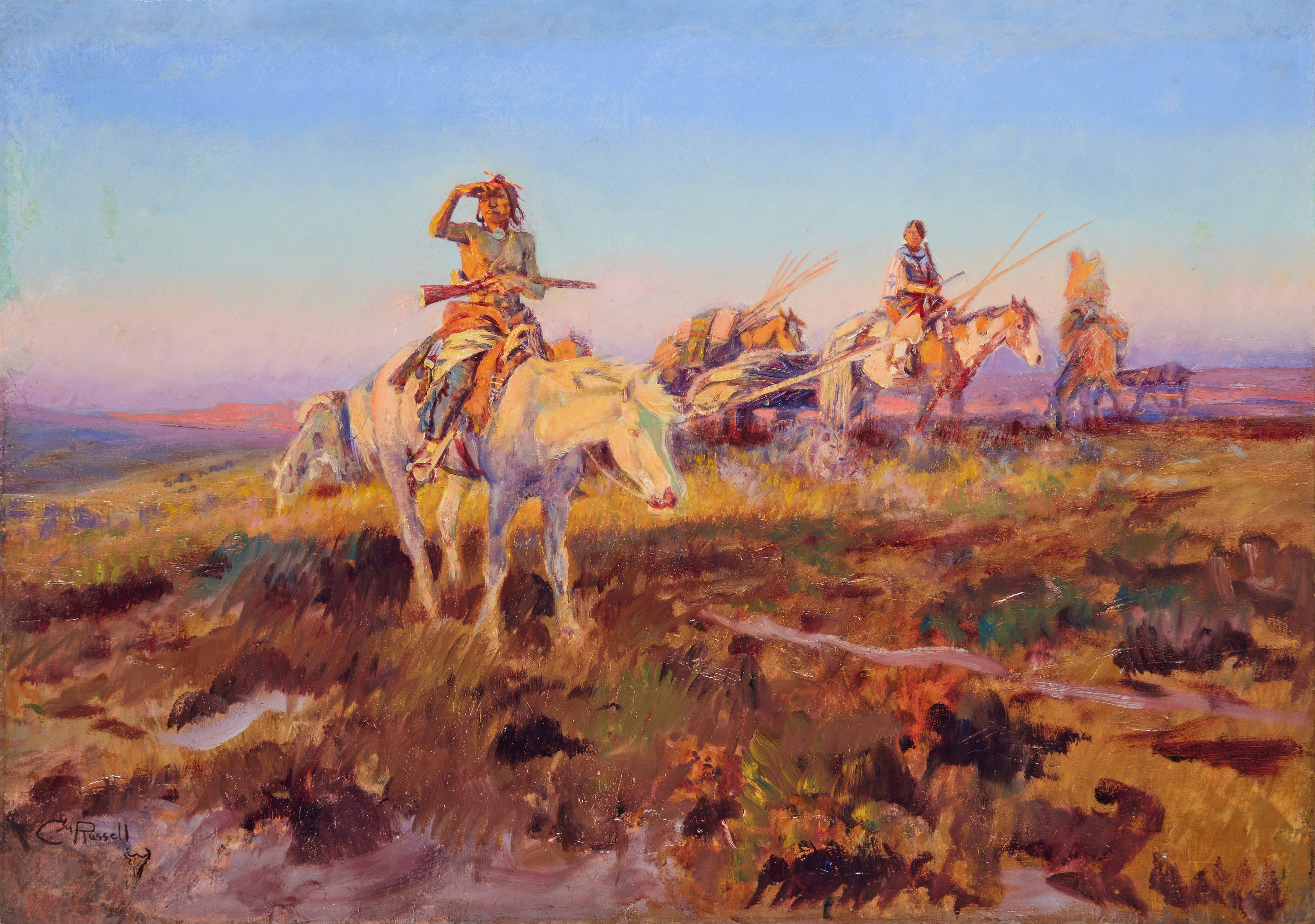 Indian Man & Woman on Horses (1864-1926) is a Western scene by American artist Russell, featuring a couple riding horses.