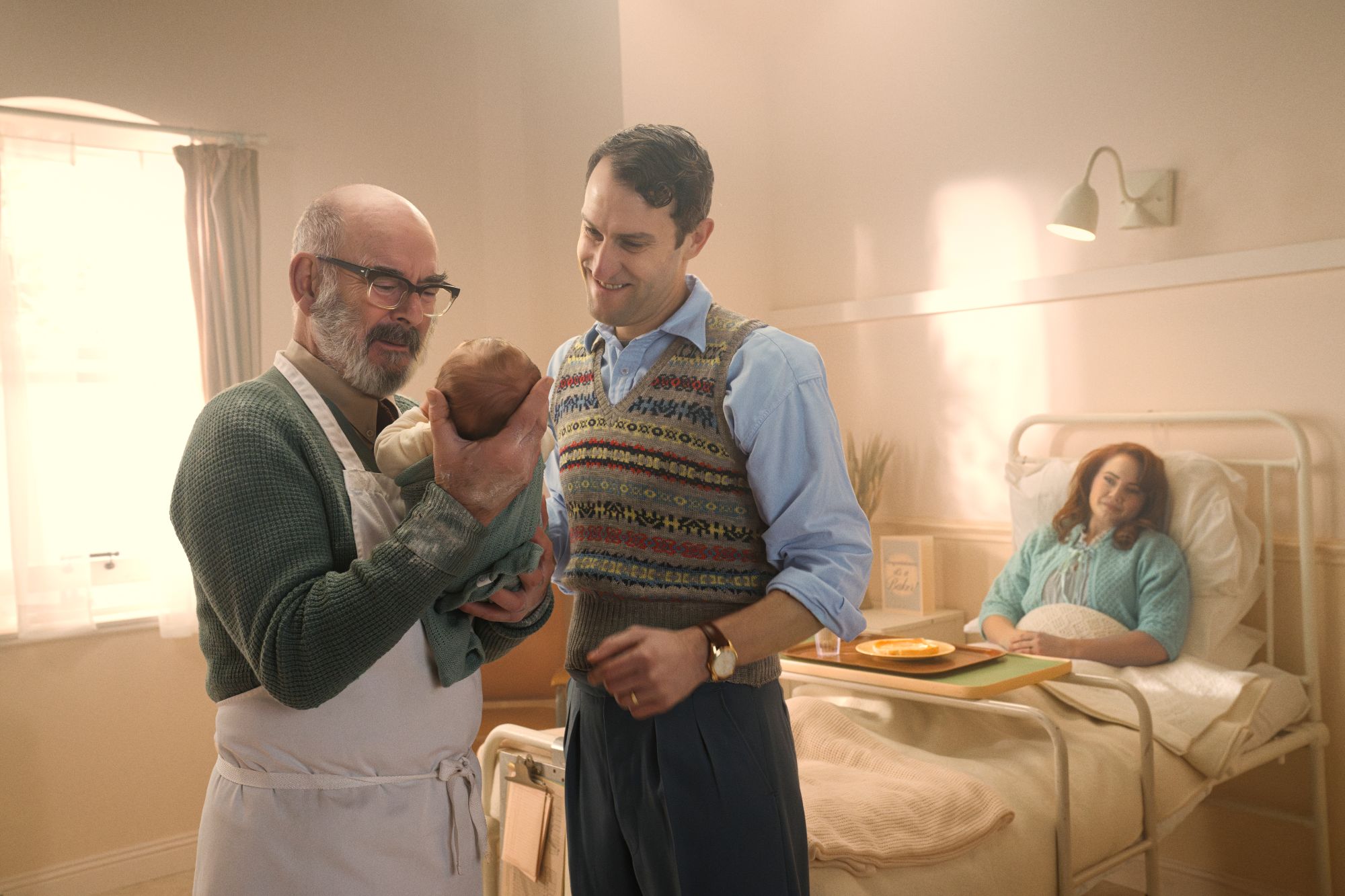 Freeman tells the story of the Warburton family’s “obsession” with baking, as the founders of the baking firm are seen carving a giant loaf of bread during a family dinner.