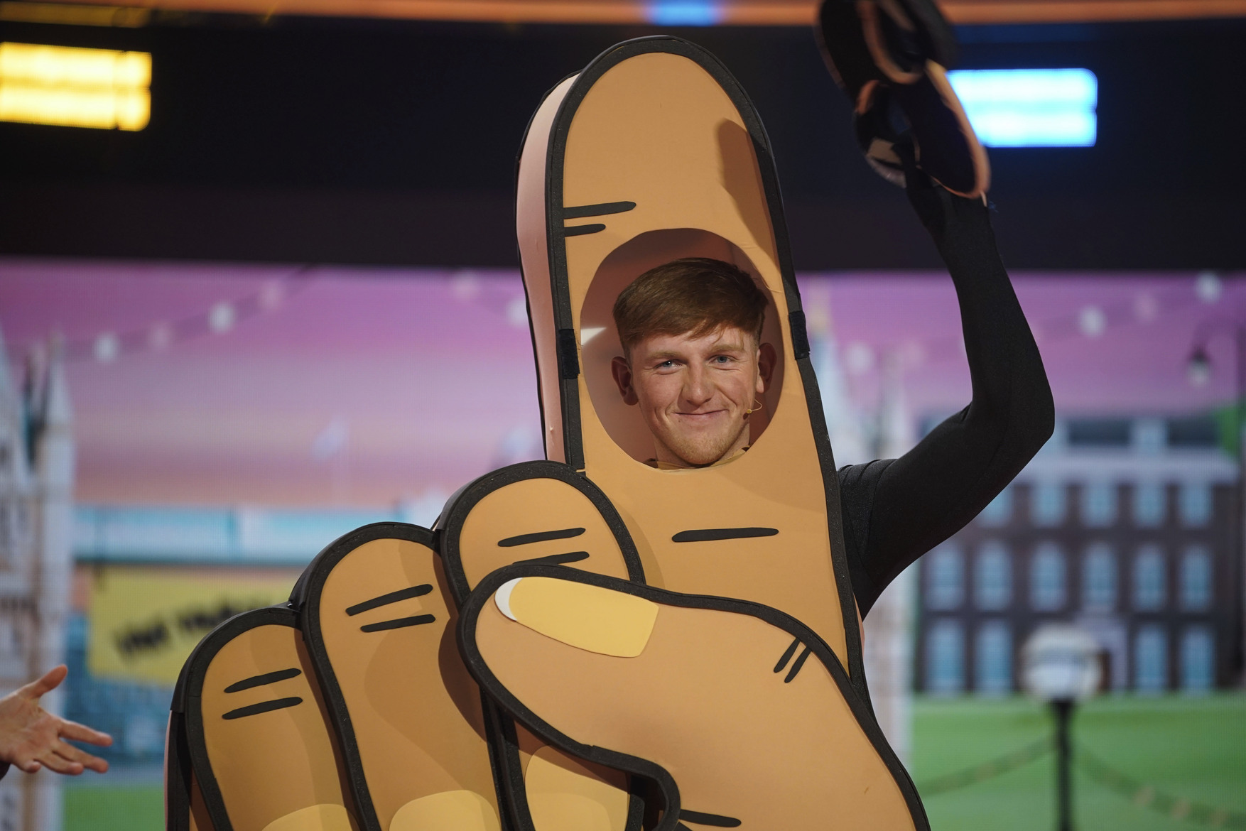 Earlier in the evening TV presenter Joel Dommett, known as the face of ITV’s The Masked Singer, took part in a parody of the show called The Masked Finger which saw a giant finger revealed as social media star AngryGinge.