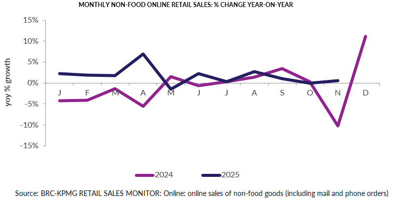 Online non-food sales increased by 0.5% against a decline of 10.3% last November, and below the average across the year of 2.5%.