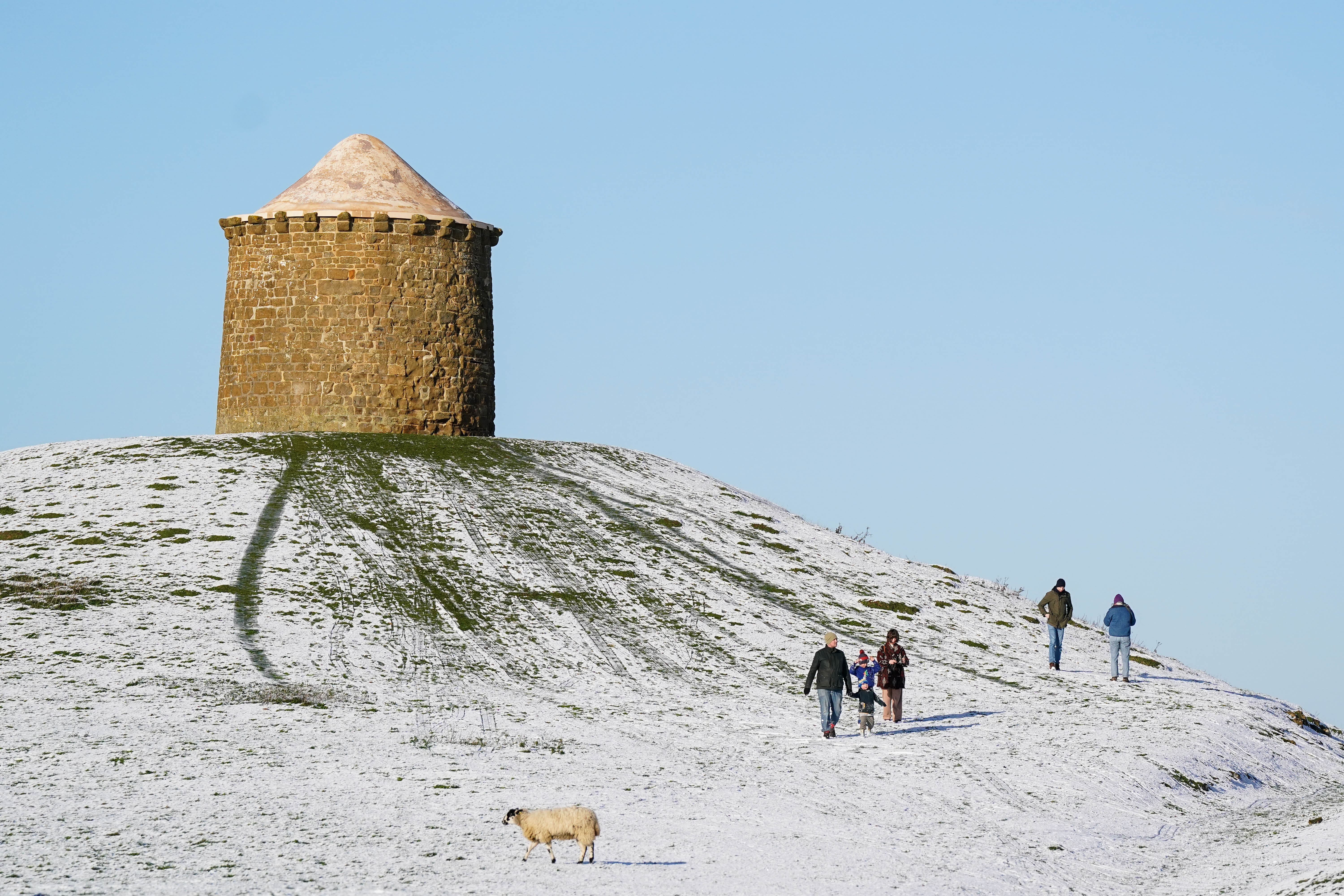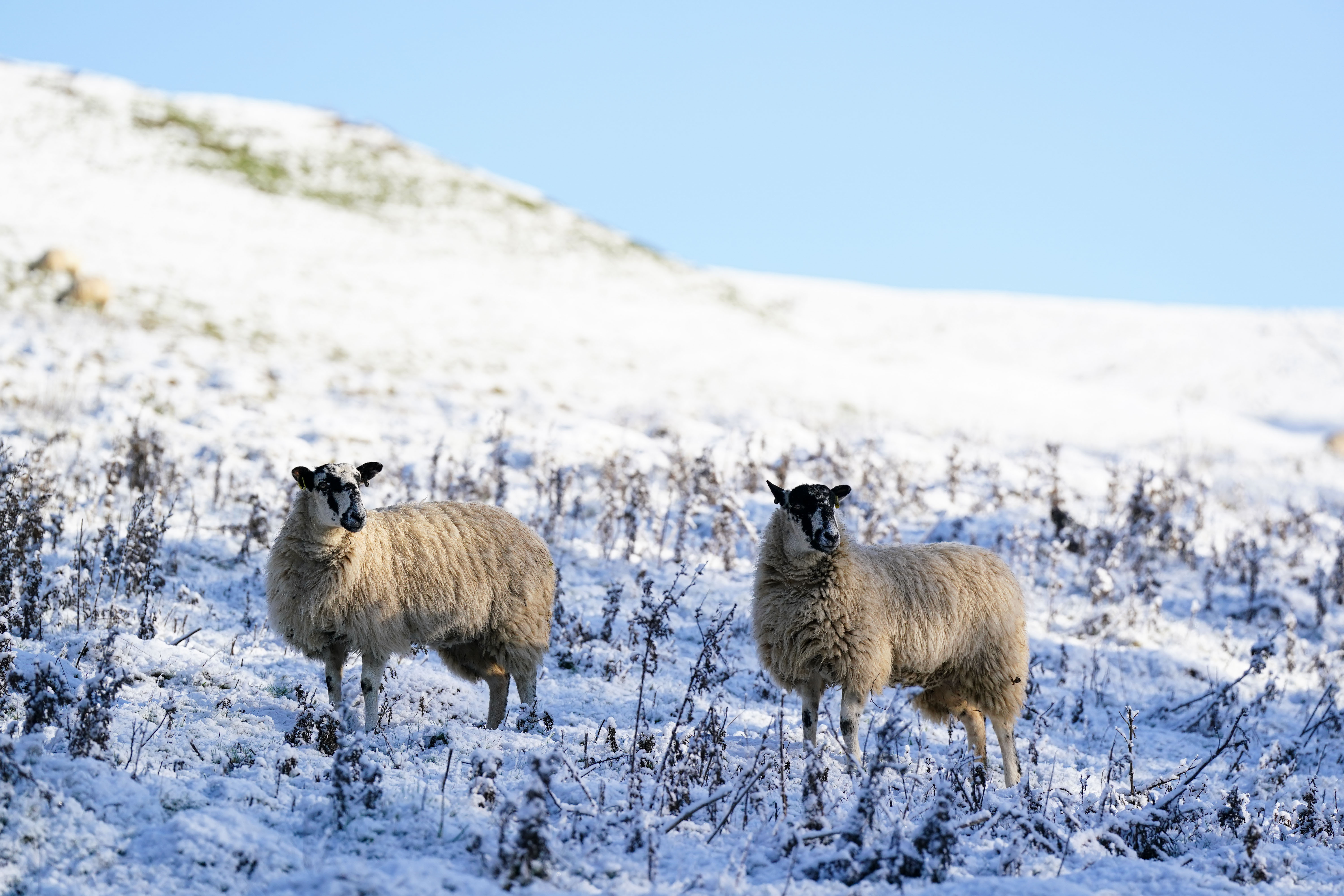 Sheep at a snow-covered Burton Dassett Hills Country Park (Jacob King/PA)