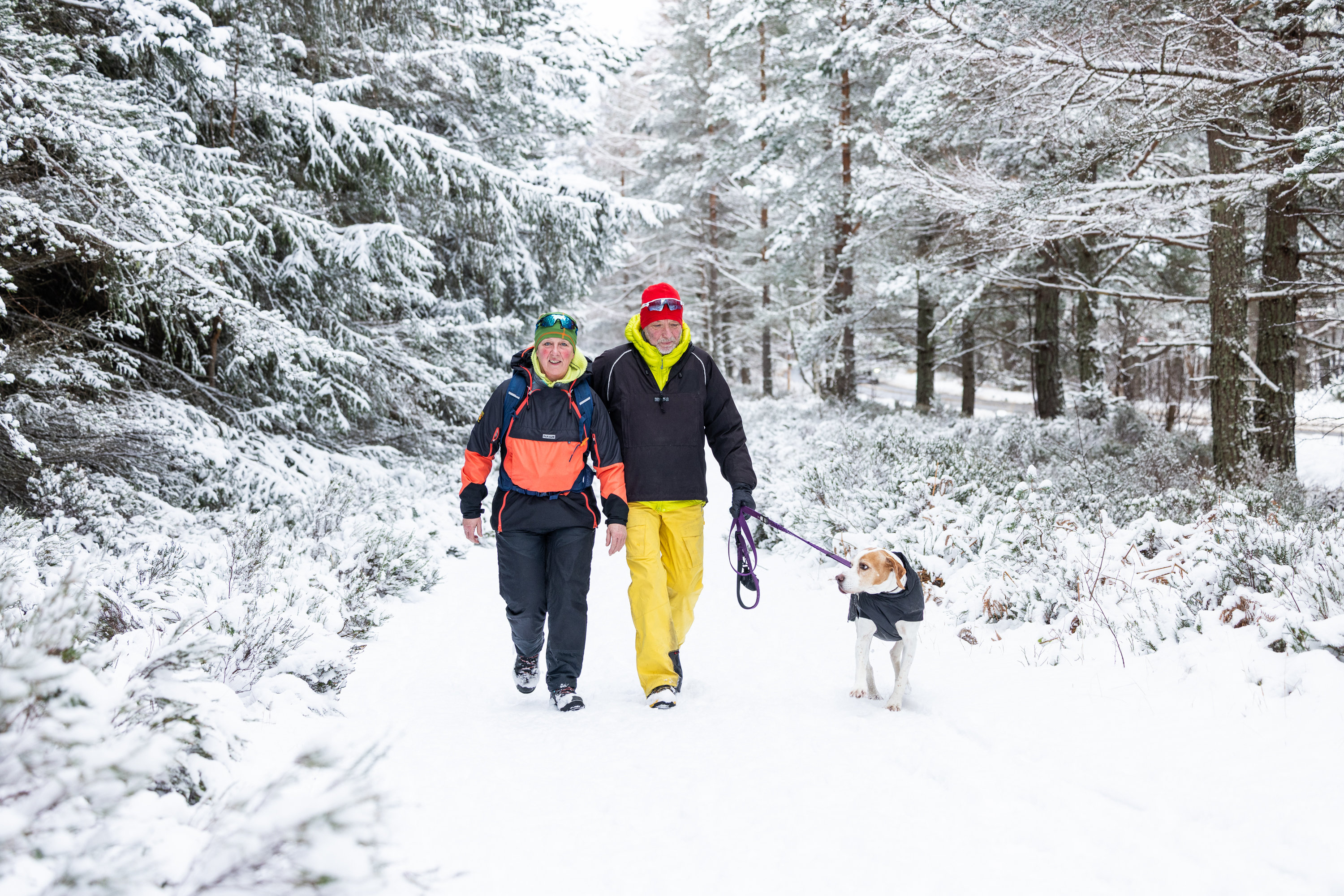 Even the dog was wrapped up warm for a brisk walk in Loch Morlich, Aviemore (Paul Campbell/PA)