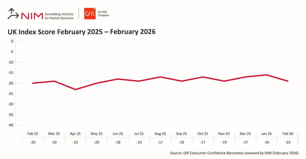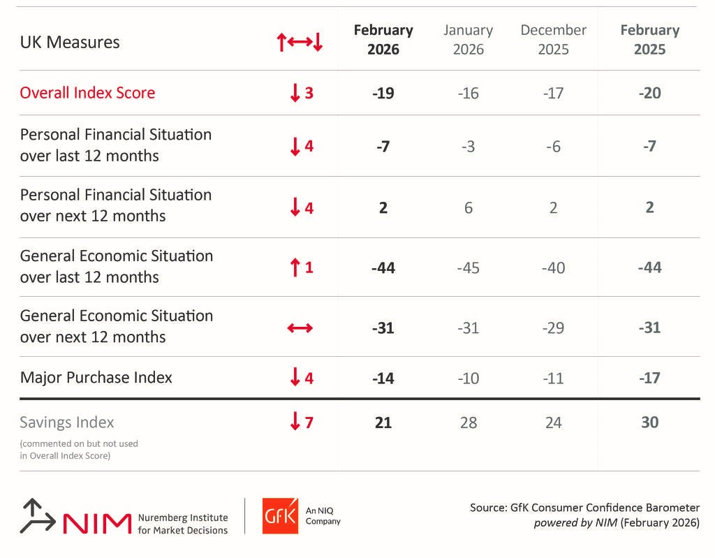 GfK’s long-running Consumer Confidence Index dropped three points to minus 19 in February to a level last seen in November, despite easing inflation.